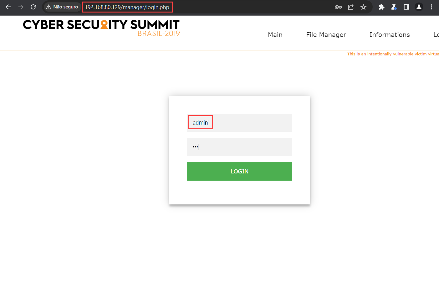 Afim de testar o comportamento da aplicação, foi realizado a tentativa de login na plataforma, informando como usuário o nome “ admin’ “, e, como pode ser visto na imagem abaixo, a aplicação retornou um erro.