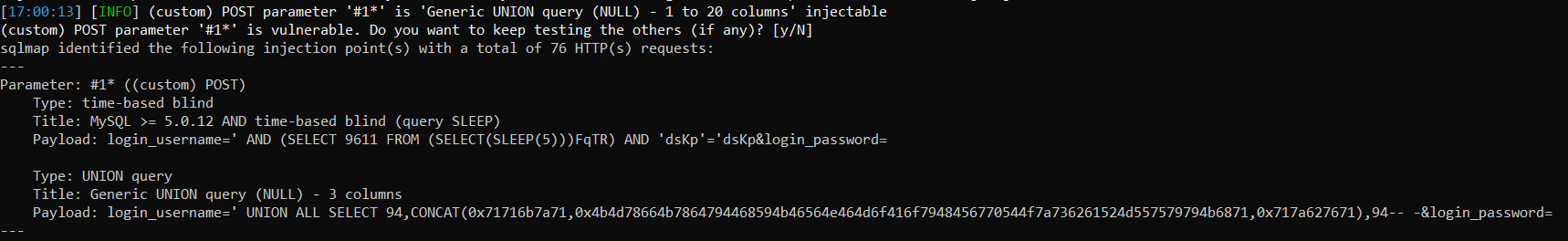 Com a confirmação da vulnerabilidade, foi utilizado a mesma ferramenta para extrair informações desse banco de dados, e, dessa forma, foi possível encontrar as credenciais de acesso a aplicação.
