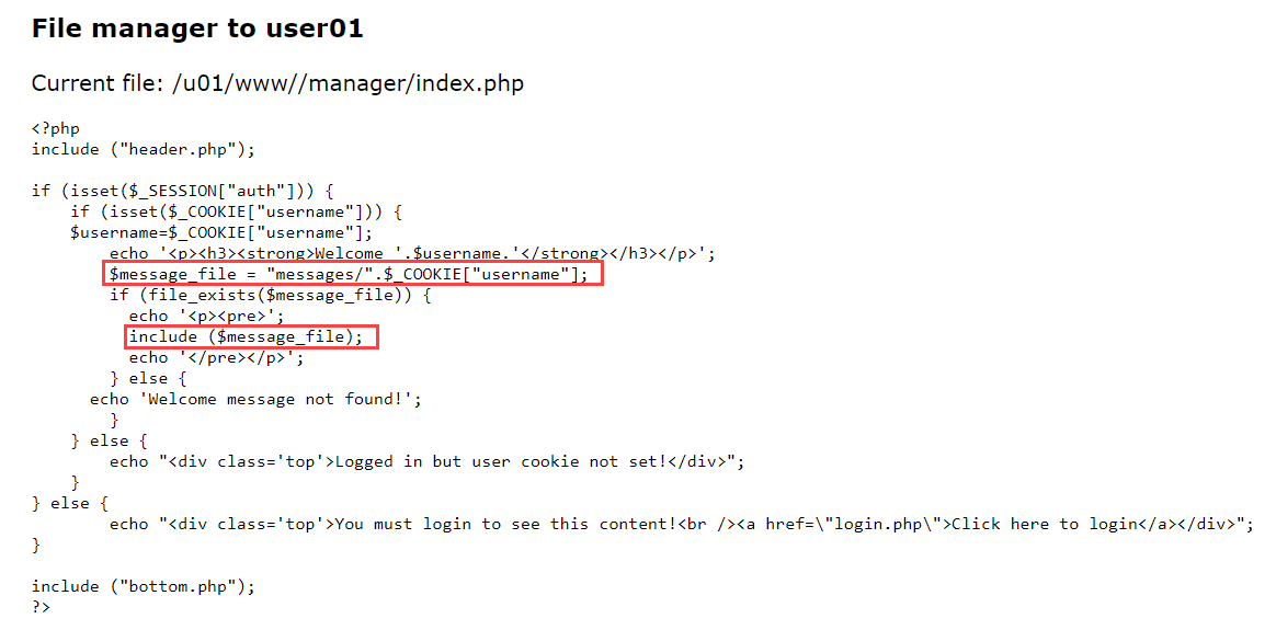 Lendo os arquivos presentes na aplicação, foi identificado no arquivo “index.php” que a mensagem apresentada para o usuário após a realização do login é processada pela função include do PHP.