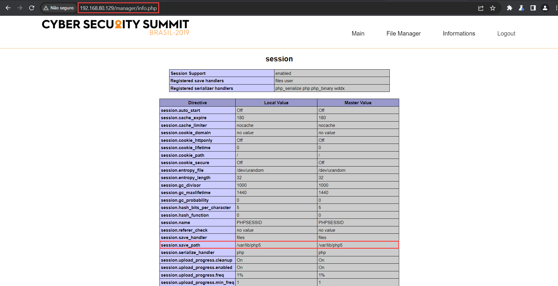 Analisando também o arquivo “info.php”, foi possível identificar o local onde os arquivos de sessão são salvos.