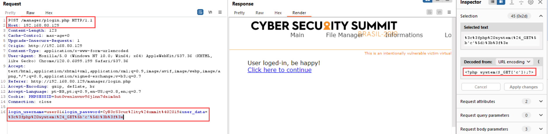 Dessa forma, foi possível notar que o parâmetro não utilizado pela aplicação também é salvo no arquivo, servindo como um possível local para injeção de conteúdo. Então utilizando esse campo foi enviado uma webshell simples para ser salva no arquivo.
