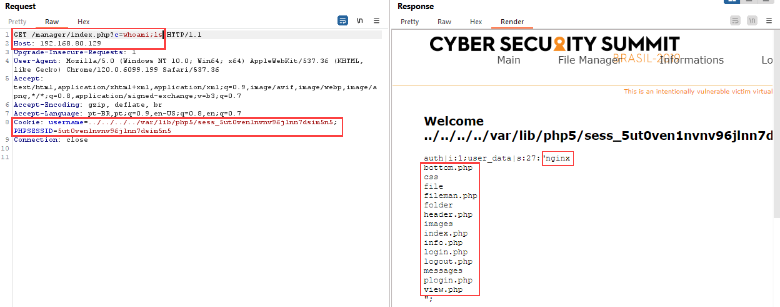 Como identificado anteriormente no código, o conteúdo do cookie “username” é interpretado pela função include, agora que já temos um arquivo no servidor com o código desejado, podemos usar ela para executar ações no servidor.