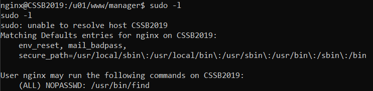 Analisando as permissões do usuário, foi possível identificar que todos os usuários do sistema possuem a permissão para executar o comando “find” como sudo.