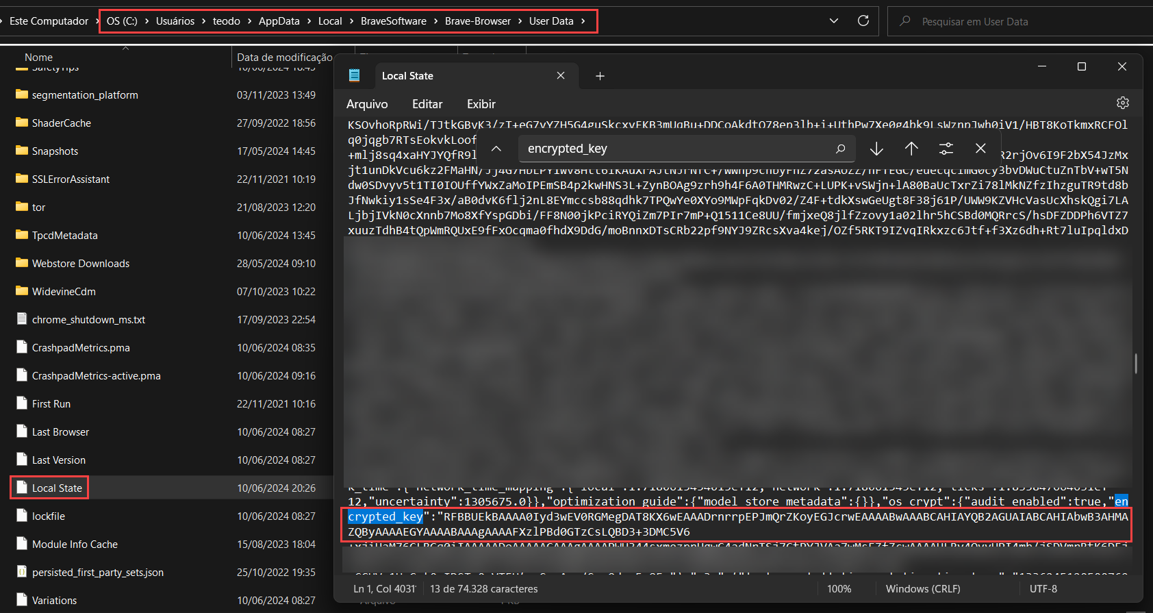 A chave criptográfica (encrypted key) é salva dentro do arquivo “Local State” que pode ser encontrado seguindo esse caminho: