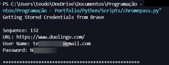Executando o script, é possível extrair as minhas credenciais salvas no navegador, nesse caso o meu acesso ao site do duolingo