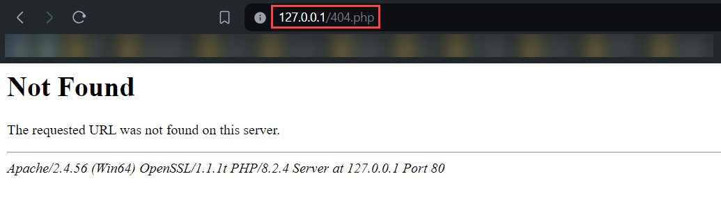 Testando acessar o endereço via navegador, o filtro inicial funciona, e o usuário é redirecionado para 404.php