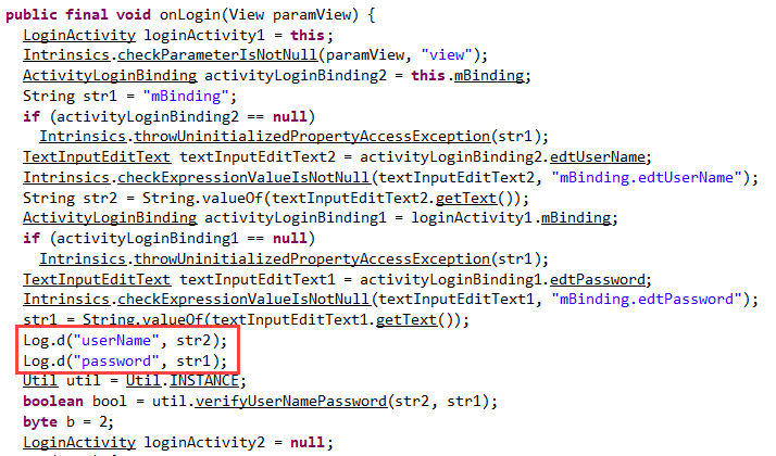 Analisando o código fonte da aplicação, foi possível identificar que o app realiza o log das informações passadas para login e senha no aplicativo.