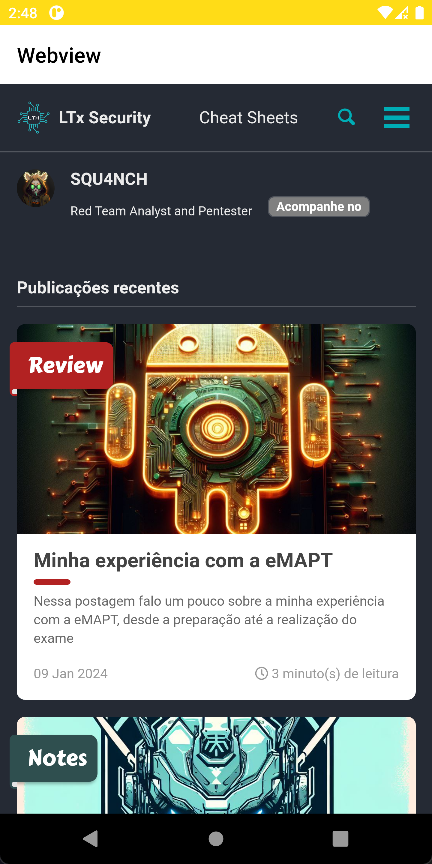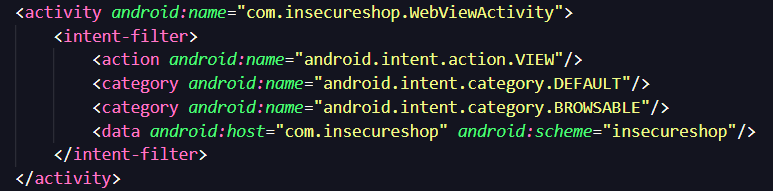 Analisando o conteúdo do arquivo “AndroidManifest.xml” foi possível identificar a classe responsável pelo webview.