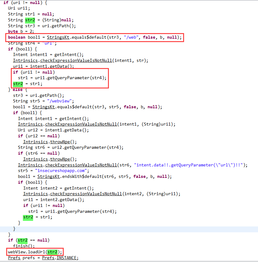 Realizando a análise do código fonte dessa classe, é possível identificar que o app realiza uma verificação, porém acaba carregando a url passada como argumento.