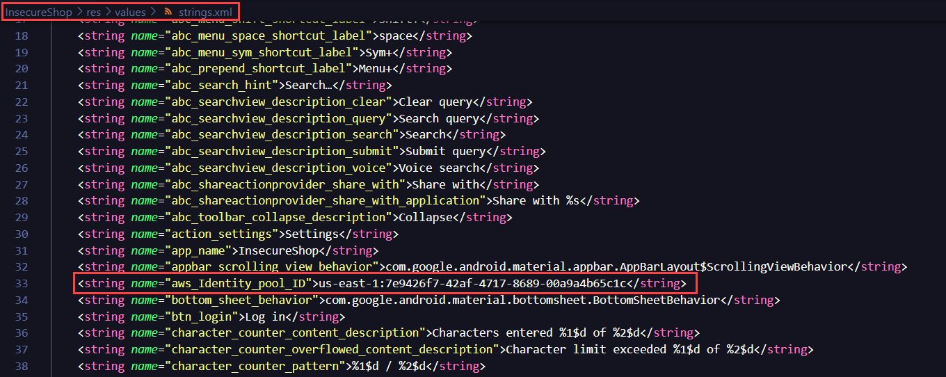 Analisando o arquivo “strings.xml” presente nos arquivos do apk, é possível encontrar o ID do Identity Pool da AWS.