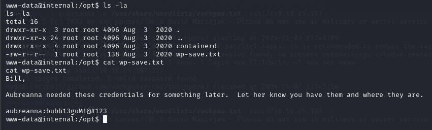 Novamente foi possível encontrar um arquivo contendo usuário e senha dentro do diretório “/opt”