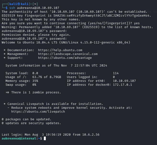 Com as credenciais encontradas, foi possível acessar o host alvo através do SSH