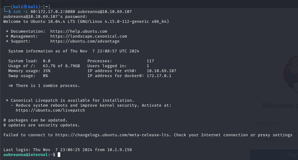 ssh -L 80:172.17.0.2:8080 aubreanna@10.10.69.107