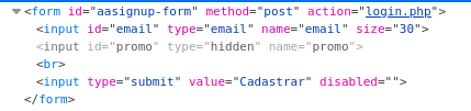 Ao inspecionar o código fonte encontrei a tag ‘disabled’ que estava impedindo de enviar o formulário da promoção