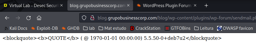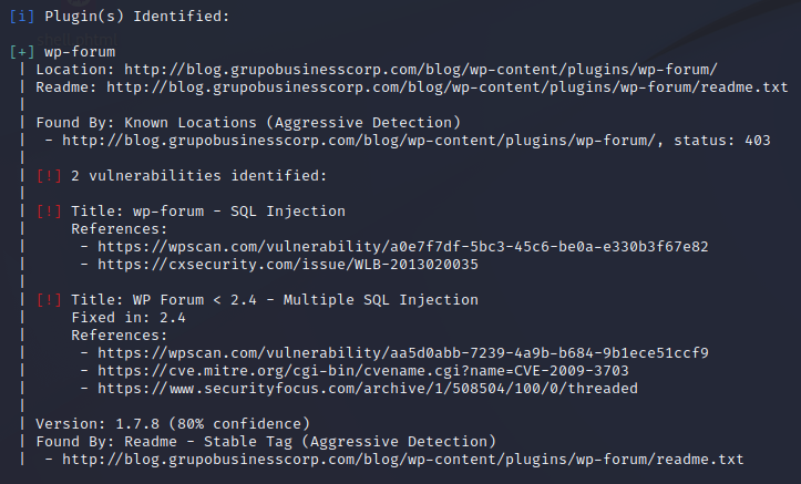 Aparentemente o wordpress está usando um plugin vulnerável a sql injection, a ferramenta tbm retorna que é possível acessar e ler o readme.txt e ao fazer isso pude comprovar a versão exata do plugin
