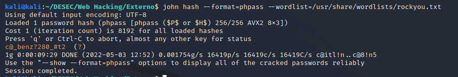 Realizando a consulta consegui o usuário porém a senha está cifrada, então foi necessário usar o john para quebrar a hash