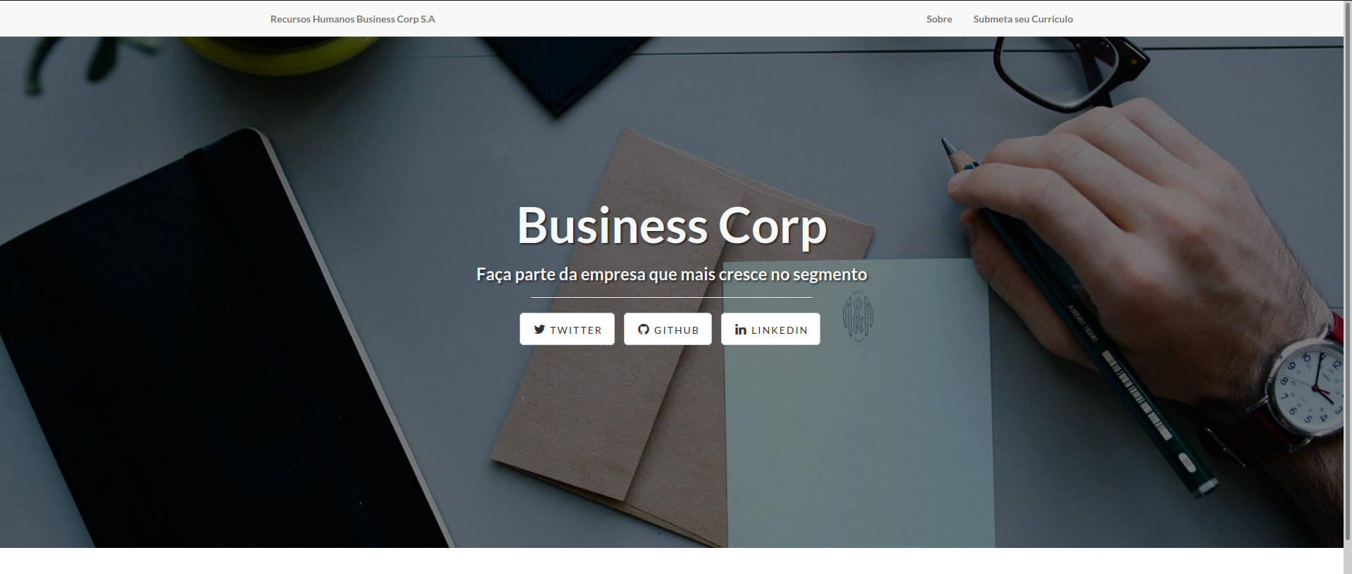 Acessando o site do rh da business corp podemos ver que ele tem duas opções no menu, uma com o conteudo sobre a empresa e uma para enviar o curriculo