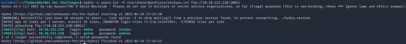 Com essa informação, criei um arquivo com esses 2 nomes e usei o hydra para descobrir a senha de acesso deles ao serviço FTP