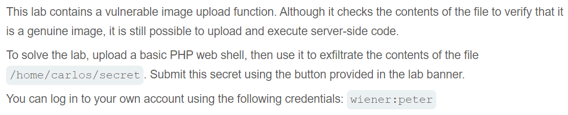 Basicamente o objetivo desse laboratório é conseguir fazer o upload de uma web shell em PHP para ler o conteúdo do arquivo “/home/carlos/secret”