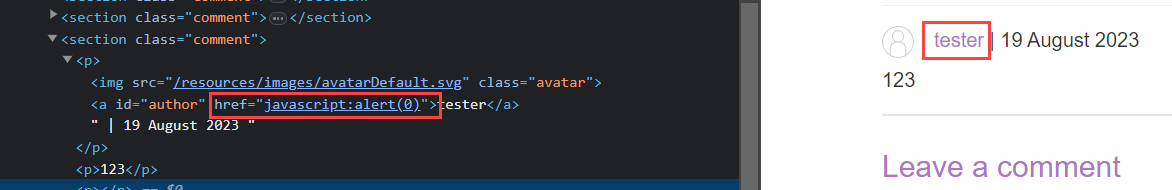 Então, enviei um comentário para entender como a aplicação se comporta, e analisando o resultado é possível ver que o website informado é armazenado dentro de um “href”
