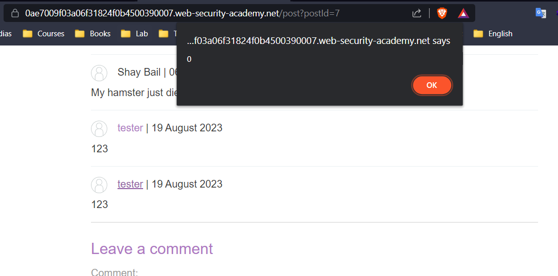 Como é possível ver na resposta da requisição, a função foi incorporada dentro da tag “script”, novamente voltei ao blog e enviei o novo payload, e o código foi executado